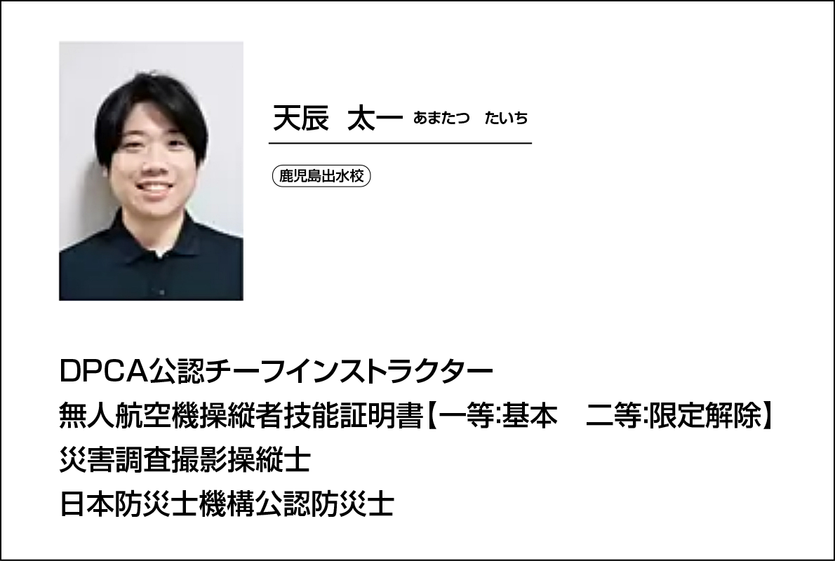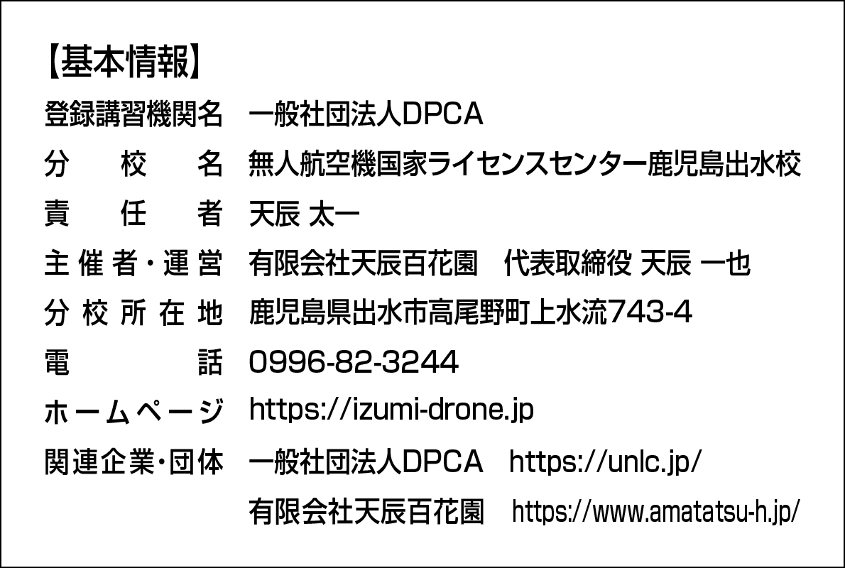 ご挨拶 無人航空機国家ライセンスセンター鹿児島出水校は「大いなる責任で安心安全な飛行を可能にする」を基本方針として安心安全な講習を実施しております。2025年4月 TOP 国家ライセンス取得を見据えた経験者認定コース 【経験者対象】二等無人航空機講習(基本)★受講推奨 【経験者対象】二等無人航空機講習 (限定変更) 【初学者対象】二等無人航空機講習 (基本) 会社案内 お申込み お問い合わせ プライバシーポリシー Instagram